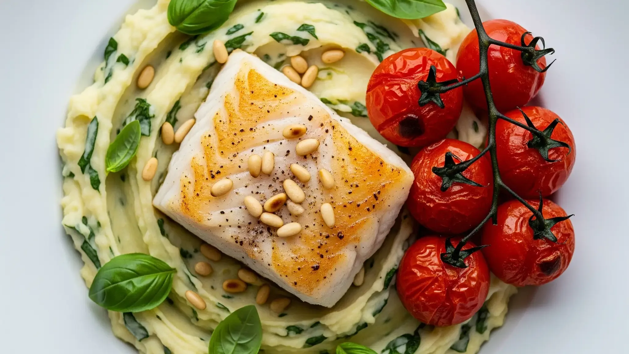 Spoon the basil mash into a deep plate, serve the cod on top, add the vine tomatoes and finish with the pine nuts.
