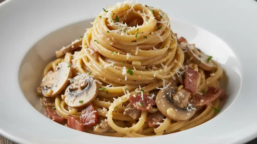 Garlic: 2.000000 cloves Linguini: 400.000000 g Mushroom (frozen): 500.000000 g Olive oil: to taste Onion: 1.000000 Salt: to taste 1. Cook the linguini pasta al dente in salted water. Peel and finely chop the onion. Peel and mince the garlic. Sauté the chopped onion and minced garlic until translucent in olive oil. Then add the still-frozen mushrooms and cook for another 2 minutes, ensuring most moisture evaporates.