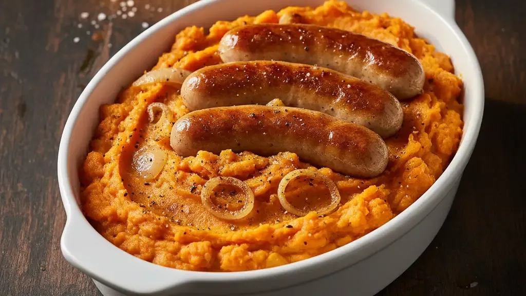 9. Serve the carrot mash ('stoemp') with chipolata sausages.